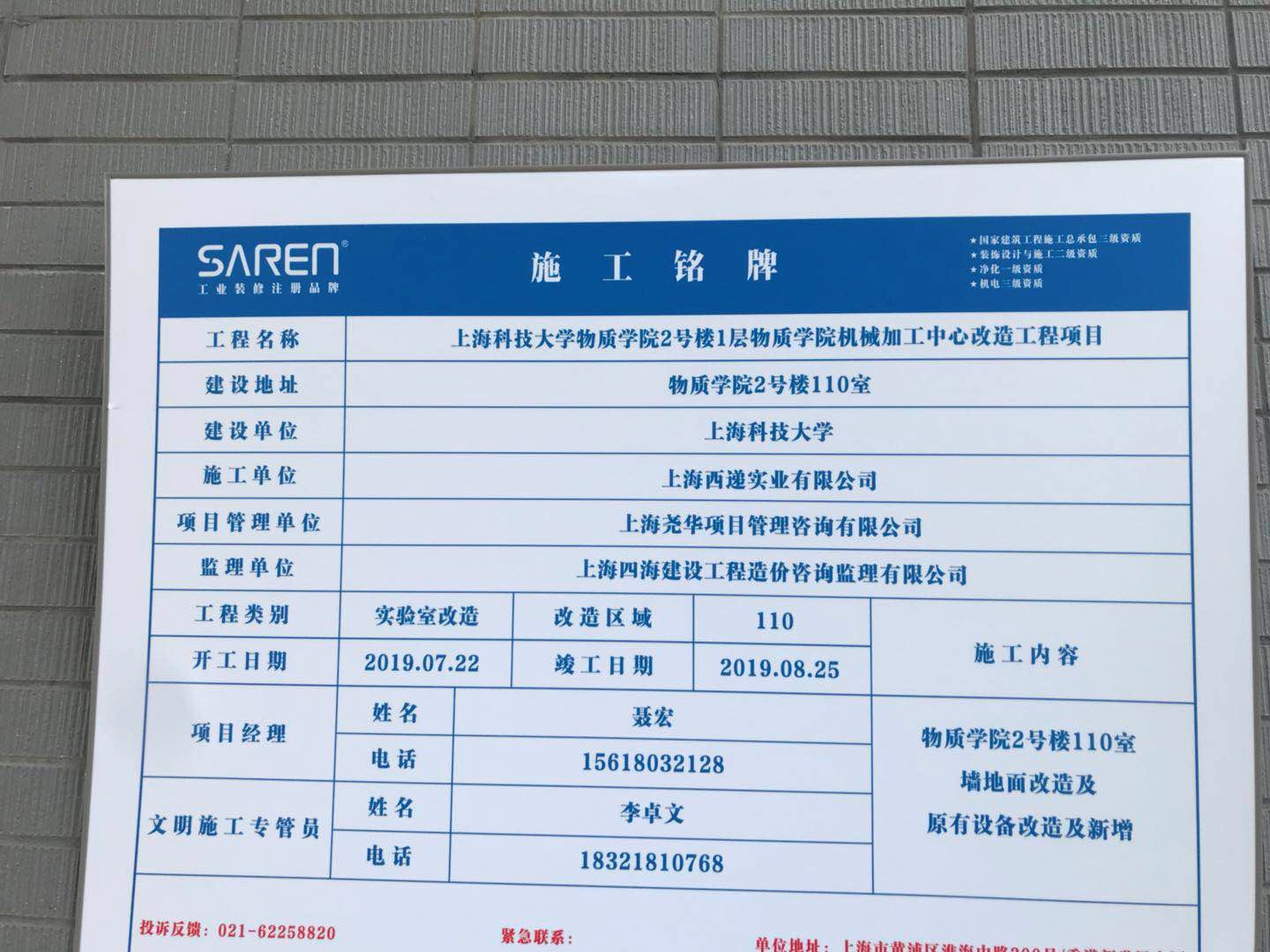 2019年7月22日,SAREN三仁与上海科技大学合作建设的物质学院机械加工中心净化装修改造工程正式开工,SAREN施工班组进场开展环境保护及文明施工工程。同时开展原有工业空间的墙地面拆除及部分门洞封堵,并完成垃圾清运。在科学严谨的施工管理下,截至8月2号,已完成隔振基础地梁处理及墙洞切割系列工程。