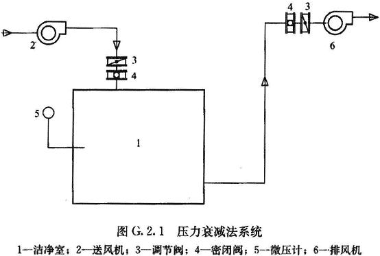 使室内达到某一正压,同时向室内补气,使室压达到要求的稳定值而不下降时的补气量即为漏泄量。使室内达到某一负压,使室压维持要求的稳定值而不下降时的抽气量即为漏泄量。