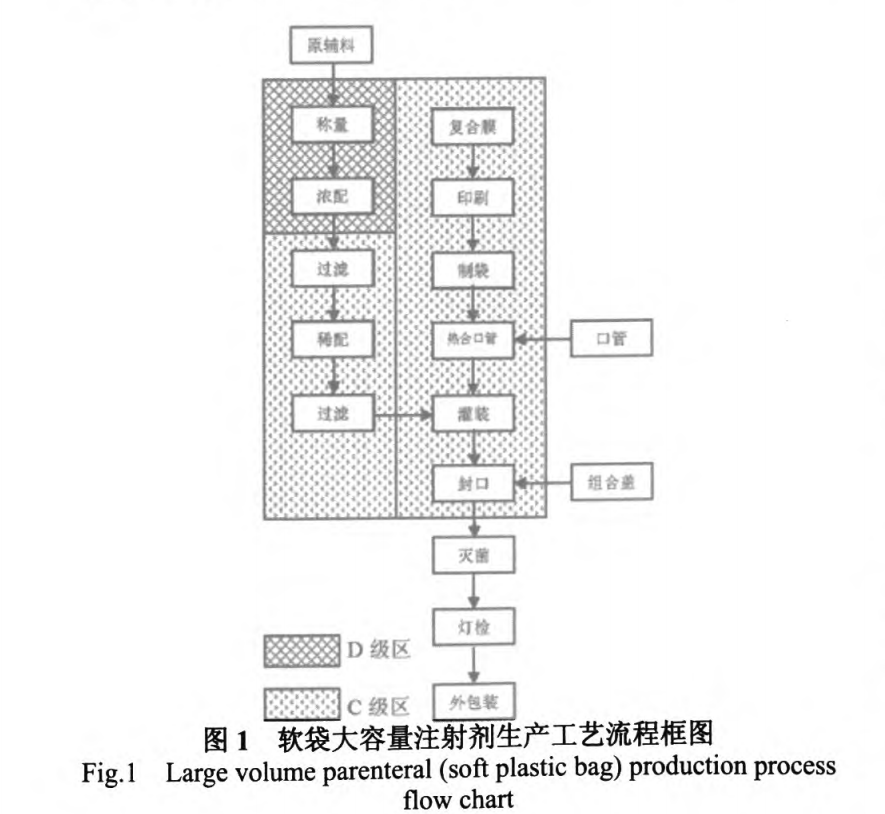 大输液的生产过程主要包括原辅料的准备、称量、浓配、稀配、灌封、灭菌、灯检、外包装等工序。图1、2、3分别为软袋大输液的生产工艺流程框图、塑瓶大输液的生产工艺流程框图以及玻瓶大输液的生产工艺流程框图。