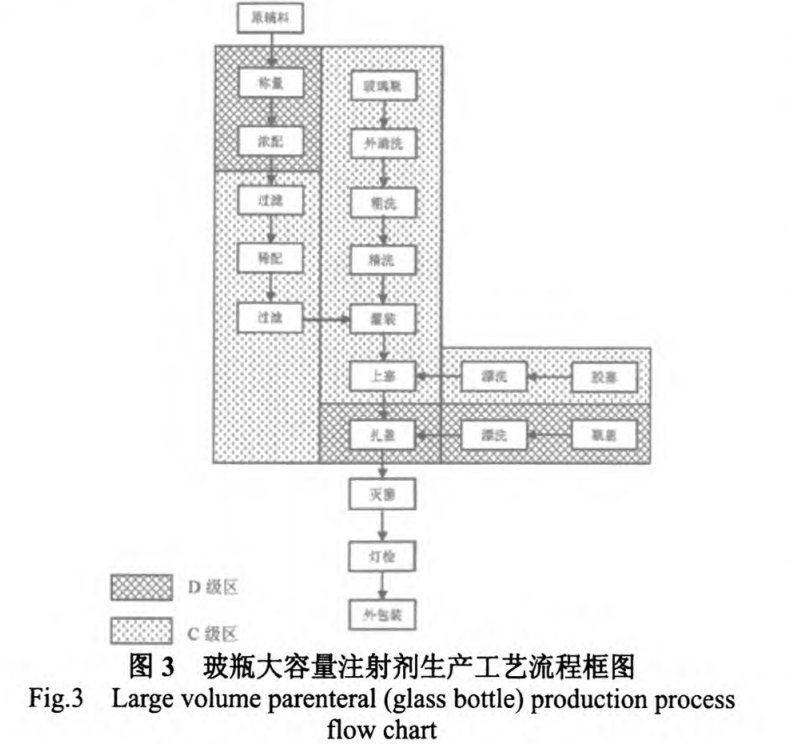 根据GMP要求“厂房的选址、设计、布局、建造和维护必须符合药品生产要求,应当能够最大限度地避免污染、交叉污染、混淆和差错,便于清洁、操作和维护”,大输液厂房的整体工艺设计方案应防止药品生产过程中的交叉污染、避免操作错误、保证生产过程的可追溯、确保药品质量。按照生产工艺流程合理进行工艺区划,充分考虑人、物流的路径便捷,生产工艺路线连续流畅,生产组织合理。